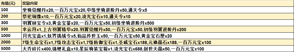 活动规则:单日累计充值达到达标金额的玩家,可以申请对应档位的礼包。(充值越多,领的越多)